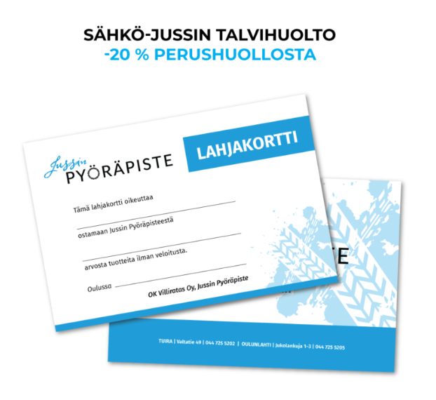 Lahjakortti ei ole käytettävissä perinteisten pyörien huoltoon. Lisätietoa Sähkö-Jussin talvihuollosta löydät täältä .