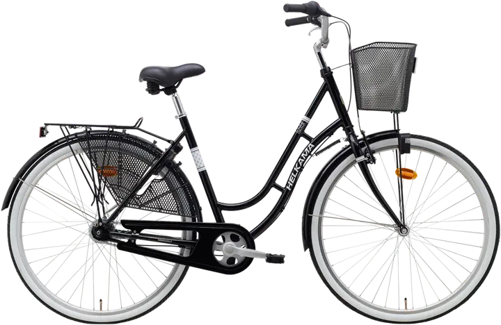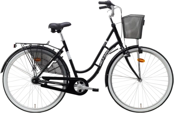 Alumiinirunkoinen kaupunkipyörä huolettomalla Shimano Nexus 7 napavaihteella ja perinteisellä jalkajarrulla. Kevyt pyörä 28″ renkaalla rullaa mukavasti ja pysty ajoasento on tuttua Helkamaa. Mallissa on nyt myös käytännöllinen etuvalo vakiona etukorin alla.