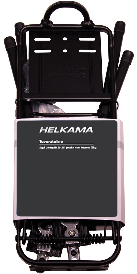 Kätevässä litteässä pakkauksessa myytävä yleismallinen Helkama tavarateline. Telineessä on jousi pienten tavaroiden mukana pysymistä helpottamaan.