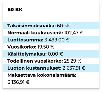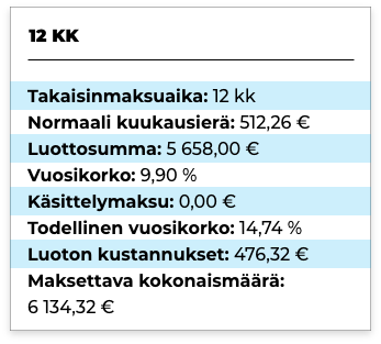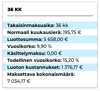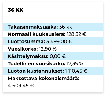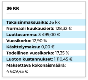 Alla oleva esimerkki laskettu Resurs Bankin pienkonerahoituksen ehtojen mukaisesti.