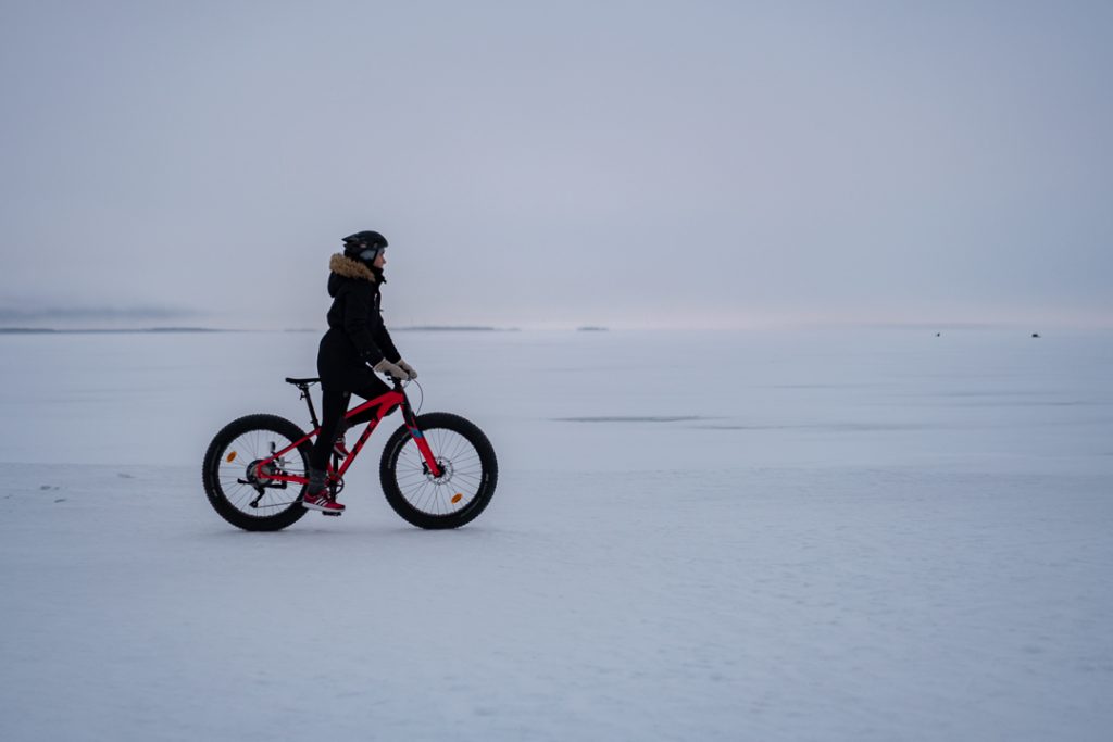 Nallikarissa mittari näyttää pakkasta -11 astetta, jonka päälle mereltä päin puhaltava jäinen viima asettaa talvipyöräilylle omat haasteensa. Pakkanen on kovettanut osan hangista, mutta läheltä rantaa löytyy myös pehmeämpää ja syvempää hankea, jossa polkuvoimat pääsevät kovalle koetukselle. Moni on puhunut fatbikellä ajamisen raskaudesta, sillä renkaat ovat huomattavasti tavallisia renkaita leveämmät ja renkaiden ilmanpaine pienempi. Polkeminen vaativimmilla alustoilla on fatbikellä kuitenkin yllättävän helppoa ja kevyttä, ottaen huomioon, ettei näille reiteille tavallisella pyörällä kannattaisi yrittääkään.