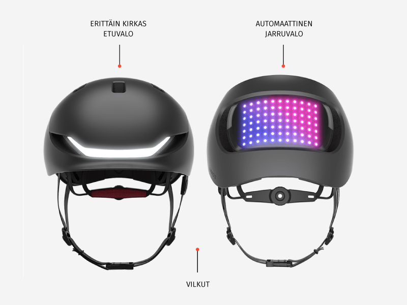 – Meiltä löytyy tällä hetkellä kaksi hienoa valokypärää, Lumos Matrix sekä Lumos Ultra. Niihin on integroitu sekä etu- että takavalot ja toiseen malliin jopa vilkut. Lisäksi kypärät ovat sillä tavalla älykkäitä, että jos ajaja esimerkiksi jarruttaa voimakkaasti, kypärän takaosan ledinäyttö varoittaa takana tulevia, kertoo Jussin Pyöräpisteen Kalle Röppänen.