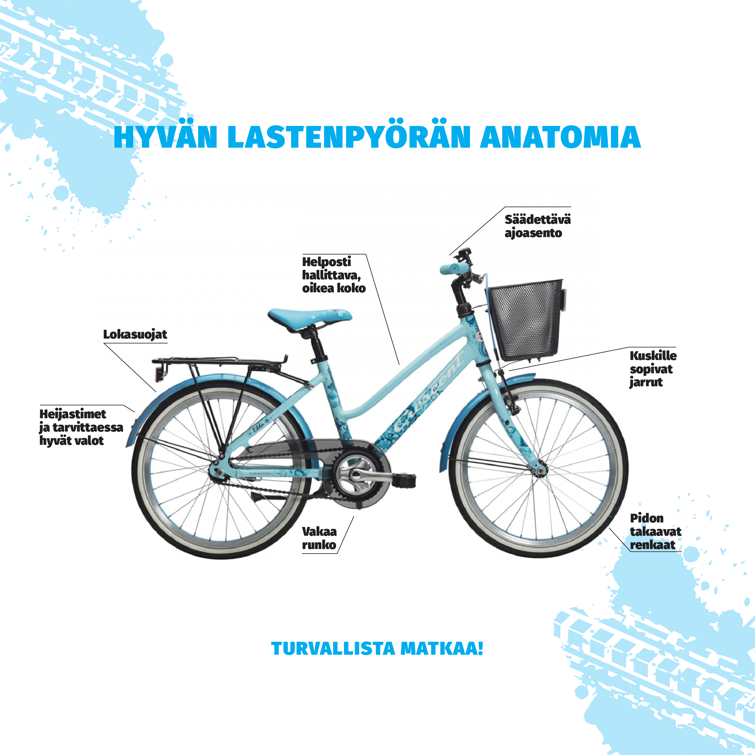Sopivankokoinen pyörä on tärkeää sekä lapsen pyöräilytaitojen kehittymisen että ajamisen turvallisuuden kannalta. Valitse siis pyörä kuskin pituuden mukaan, silloin pyörä on helpommin hallittava ja ajaminen mukavaa. Kasvuvara ei tässä asiassa kannata.