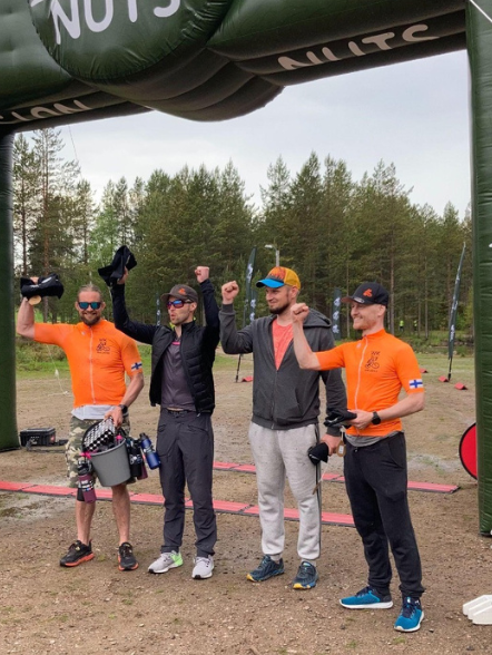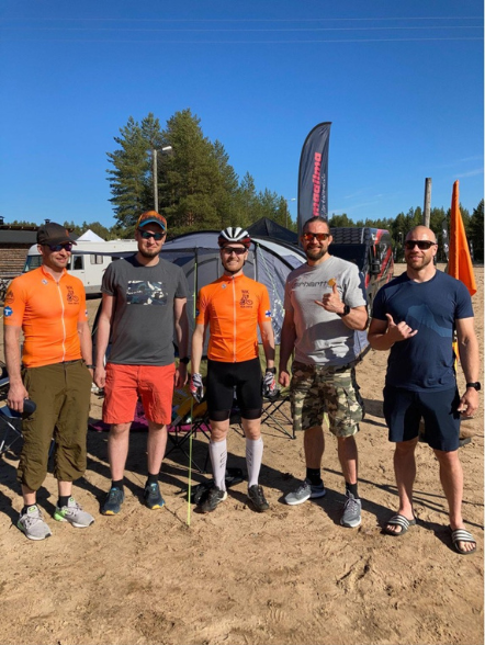 10 min starttiin ja miehiä naurattaa. Kuvassa Heikki, Tuomas, Arto, Paavo ja Janne.